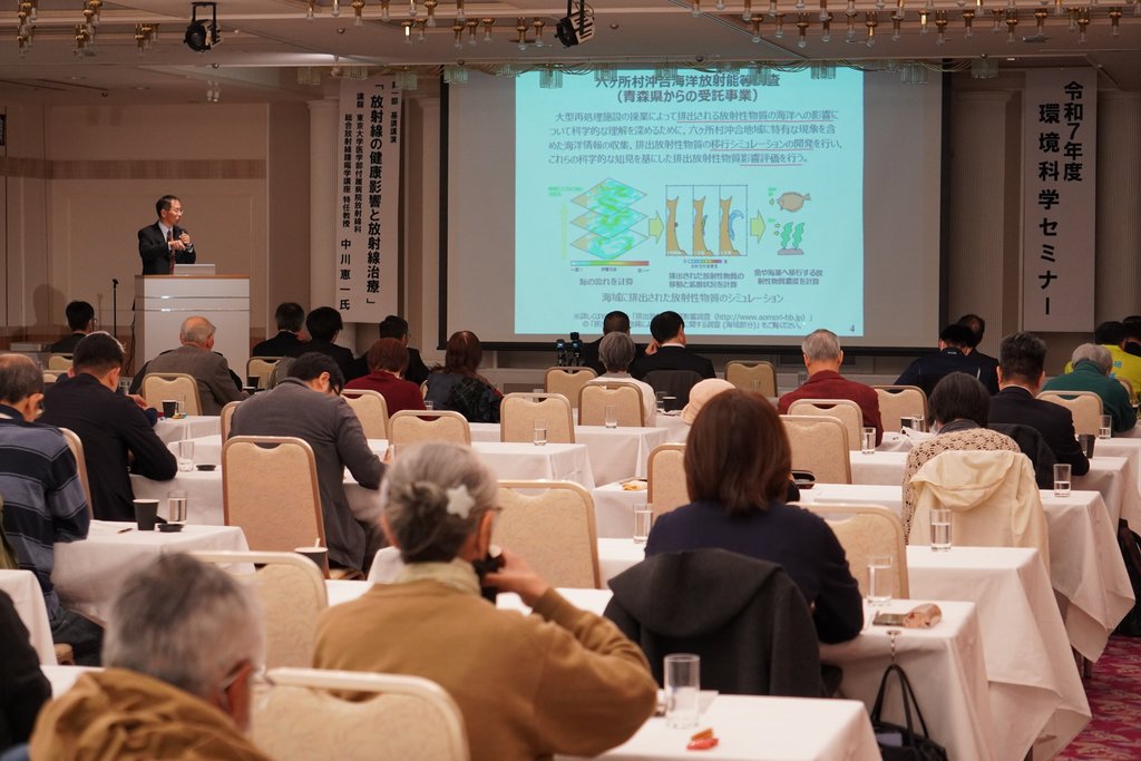 第二部では、環境科学技術研究所 環境影響研究部の 植田真司 から「環境中の放射性物質はどのように動くの? ~再処理工場から排出される放射性物質の動きを探る~」、また日本海洋科学振興財団 むつ海洋研究所の 小藤久毅 から「六ヶ所村周辺の海洋放射能」と題した研究成果が報告されました。